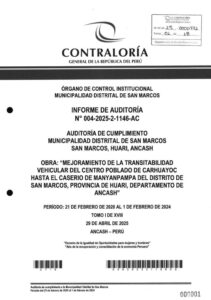 La Contraloría General determinó un perjuicio económico de S/ 874 326 en la Municipalidad Distrital de San Marcos, provincia de Huari, como consecuencia de pagos realizados por el mejoramiento de la vía que se extiende desde el centro poblado de Carhuayoc hasta el caserío de Manyanpampa, pese a que algunas partidas incumplieron las especificaciones técnicas y se reconocieron trabajos (metrados) no ejecutados.