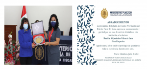 ☑️ Mediante una pequeña y significativa ceremonia, la presidenta de la Junta de Fiscales Superiores del Distrito Fiscal del Santa, Aura Violeta Carrasco Chapoñán, reconoció