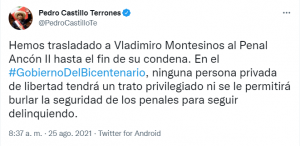 lo menciono el presidente Pedro Castillo El presidente informó que el reo Vladimiro Montesinos Torres fue trasladado al Penal Ancón II hasta el fin de