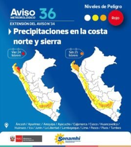 Aviso N°036 ROJO PRECIPITACIONES EN LA COSTA NORTE Y SIERRA (EXTENSIÓN DEL AVISO 034) Inicio del evento:Viernes , 24 de Febrero de 2023 a las 00:00