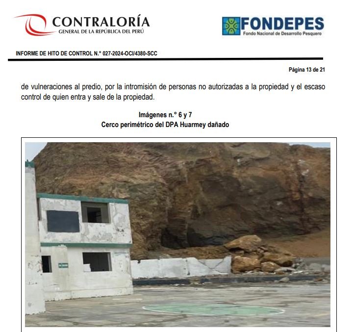 La Contraloría ha emitido un informe de Hito de Control N ° 12 Aprobación del Quinto Entregable del expediente técnico de la obra de mejoramiento de servicios del Desembarcadero Pesquero Artesanal Puerto Huarmey ; que ejecuta el Fondo Nacional De Desarrollo Pesquero (FONDEPES) por S/ 20,683,633.20; en el que se advierte que: