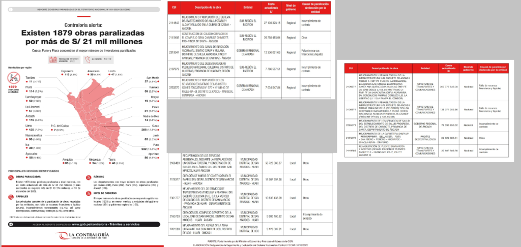 La Contraloría General informó que existen 1879 obras públicas paralizadas a nivel nacional las cuales no se han concluido y no reportan ningún avance en su ejecución física durante más de seis meses. Dichas inversiones suman los S/ 21 mil 595 millones, de los cuales falta ejecutar un saldo de más de S/ 10 374 millones, al 31 de diciembre del 2022.