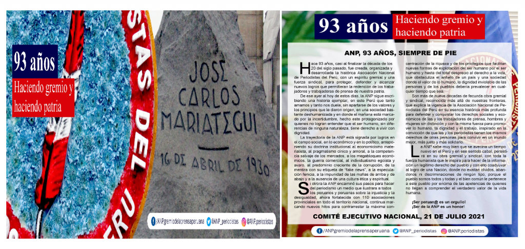 Hace 93 años, casi al finalizar la década de los 20 del siglo pasado, fue creada, organizada y desarrollada la histórica Asociación Nacional de Periodistas del Perú, con un espíritu gremial y una fuerza sindical, para proteger, defender y alcanzar nuevos logros que permitieran la redención de los trabajadores y trabajadoras de prensa de nuestra patria.