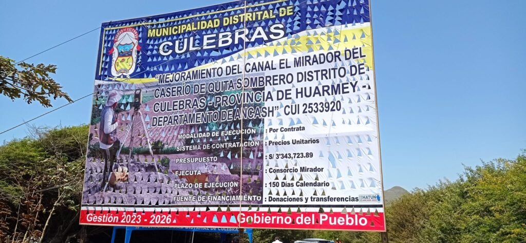 Se realiz贸 la ceremonia de colocaci贸n de primera piedra y acto de entrega de terreno, para la ejecuci贸n de la obra: Mejoramiento del canal el Mirador del Caser铆o de Quitasombrero, en este acto estuvieron presentes, el Consejero Regional de Huarmey Hugo Roca, las autoridades del Concejo Distrital de Culebras, Alcalde Luis Yauri Quito y los regidores Naysha Dom铆nguez, Johana Honorio, Rosario Reyes, Luis Ch谩vez y Yito Valerio.