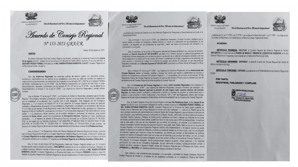 Según el ACUERDO DE CONSEJO REGIONAL Nª 133-2021-GRA/CR de fecha 05 de agosto, aprobado por la mayoría de consejeros regionales, a propuesta del consejero regional de la provincia del Santa Ing. Rubén Sandoval Calvo, establece que el Ejecutivo Regional debe IMPLEMENTAR EL CIRCUITO VIAL para la prueba de manejo y emisión de licencias de conducir, en la Sub Dirección Regional de Transportes y Comunicaciones con sede en la provincia del Santa.