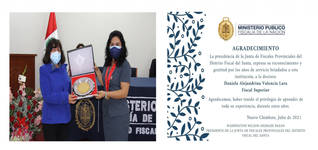 ☑️ Mediante una pequeña y significativa ceremonia, la presidenta de la Junta de Fiscales Superiores del Distrito Fiscal del Santa, Aura Violeta Carrasco Chapoñán, reconoció y agradeció los 32 años de servicio a favor del Ministerio Público brindados por la Fiscal Superior de la Segunda Fiscalía Superior Penal del Santa, Daniela Alejandrina Valencia Lara.