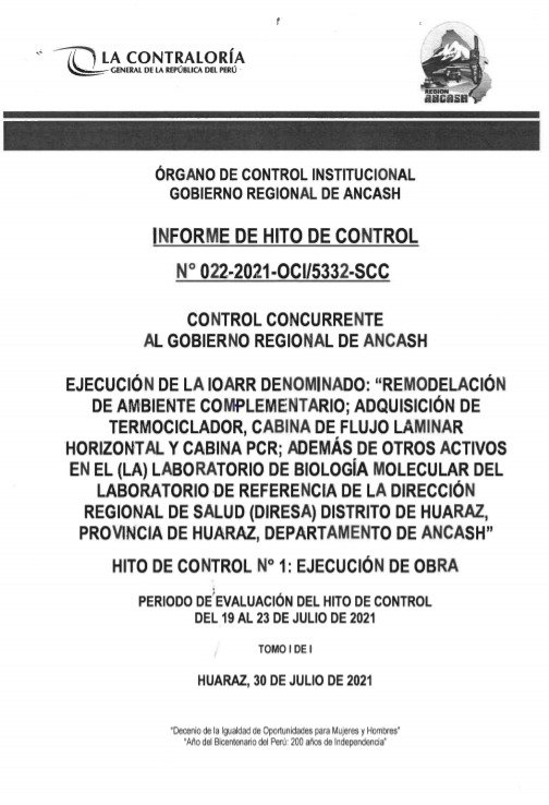 La Contraloría General alertó que el Gobierno Regional de Áncash (GRA) no culmina la construcción del ambiente complementario para la realización de pruebas moleculares de diagnóstico de COVID-19, previsto para hace nueve meses; situación que viene afectando los planes de la Dirección Regional de Salud (DIRESA) para la contención de la pandemia.