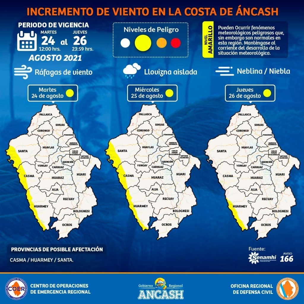 El Centro de Operaciones de Emergencia Regional – COER Áncash informa que, desde las 12:00 horas del martes 24 hasta las 23:59 horas del jueves 26 de agosto, se registrará el incremento de viento en la costa de Áncash.