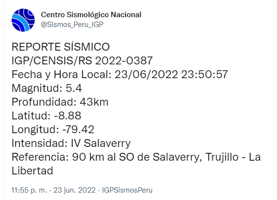 El epicentro del sismo de este jueves 23 de junio de 2022 se localizó a 90 kilómetros al suroeste de Salaverry, en la provincia de Trujillo, región de La Libertad.